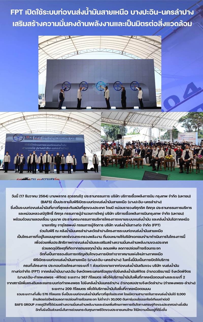 FPT เปิดใช้ระบบท่อขนส่งน้ำมันสายเหนือ บางปะอิน-นครลำปาง เสริมสร้างความมั่นคงด้านพลังงานเเละเป็นมิตรต่อสิ่งเเวดล้อม