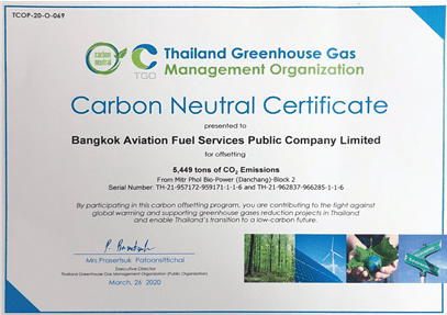 บริษัท บริการเชื้อเพลิงการบินกรุงเทพ จำกัด (มหาชน) ได้รับการรับรองให้เป็น Carbon Neutral จากองค์การบริหารจัดการก๊าซเรือนกระจก (องค์กรมหาชน)