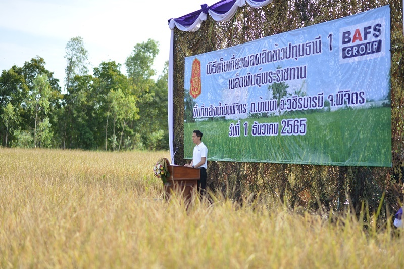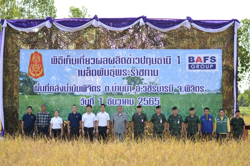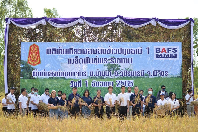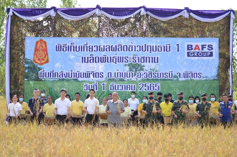 เมื่อเร็วๆนี้ หม่อมหลวง ณัฐสิทธิ์ ดิศกุล กรรมการผู้อำนวยการใหญ่ กลุ่มบริษัทบริการเชื้อเพลิงการบินกรุงเทพ จำกัด (มหาชน) เข้าร่วมในพิธีเกี่ยวข้าวพันธุ์พระราชทาน ปทุมธานี 1 เมล็ดพันธุ์พระราชทานโครงการทหารพันธุ์ดี เพื่อถ่ายทอดองค์ความรู้ในการปลูกข้าวแบบเกษตรอินทรีย์ บนพื้นที่คลังน้ำมัน บริษัท ขนส่งน้ำมันทางท่อ จํากัด หรือ FPT ที่ อ.วชิรบารมี จ.พิจิตร โดยมีพนักงานในเครือ BAFS GROUP เข้าร่วมพิธีเกี่ยวข้าวพันธุ์พระราชทานในครั้งนี้ด้วย