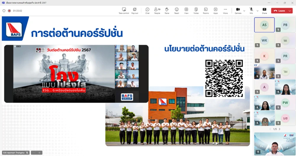 นอกจากนี้ บริษัท BAFS ยังได้เชิญชวนและให้คำปรึกษากับคู่ธุรกิจที่ประสงค์จะเข้าร่วม โครงการ CAC (Collective Action Against Corruption) เพื่อประกาศเจตนารมณ์ในการต่อต้านการทุจริตและขอรับรองการเป็นสมาชิกโครงการ ซึ่งเป็นส่วนหนึ่งของความมุ่งมั่นในการสร้างธุรกิจที่มีจริยธรรม โปร่งใส และยั่งยืนการจัดสัมมนาครั้งนี้สะท้อนถึงความสำคัญของการพัฒนาความสัมพันธ์ระหว่าง BAFS และคู่ธุรกิจในระยะยาว โดยมุ่งเน้นการส่งเสริมการทำธุรกิจที่มีความรับผิดชอบต่อสังคมและสิ่งแวดล้อม พร้อมทั้งให้ความสำคัญกับการต่อต้านการทุจริตในทุกขั้นตอนการดำเนินงาน