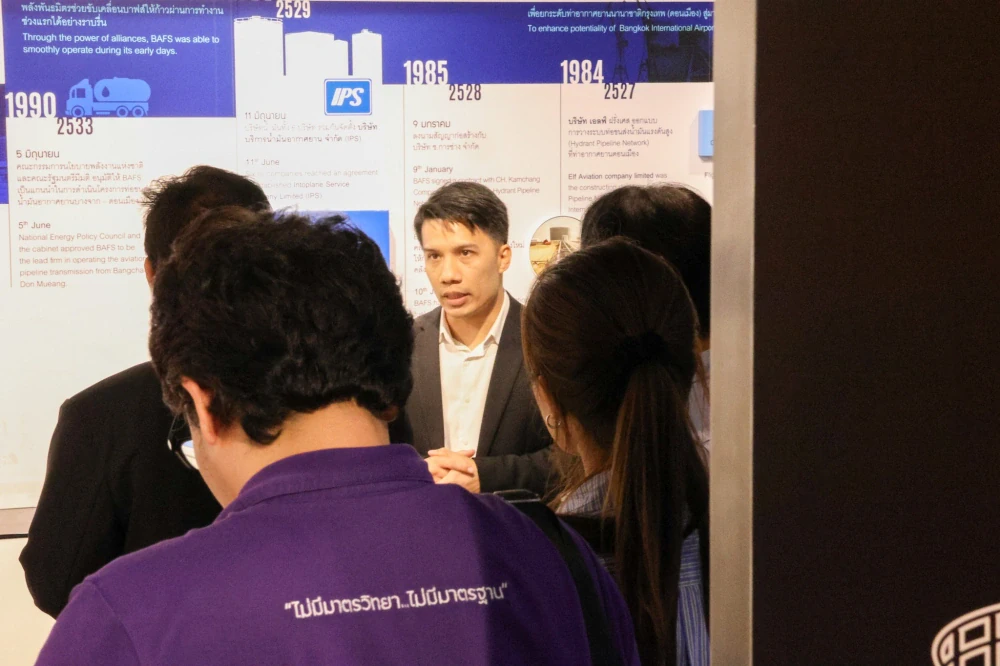 คณะผู้แทนได้รับฟังการบรรยายเกี่ยวกับความสำคัญและแนวโน้มของการใช้เชื้อเพลิง SAF รวมถึงข้อมูลเกี่ยวกับกระบวนการผลิตน้ำมันอากาศยานแบบยั่งยืนที่เป็นมิตรต่อสิ่งแวดล้อม ซึ่งเป็นหนึ่งในแนวทางการดำเนินงานตามนโยบายของ BAFS นอกจากนี้ ยังได้เยี่ยมชมนิทรรศการ BAFS Connect ความเป็นมา การพัฒนา รวมถึงความก้าวหน้าในด้านการให้บริการน้ำมันอากาศยาน ณ สถานีบริการจัดเก็บน้ำมันอากาศยานดอนเมือง (DMK-Storage)