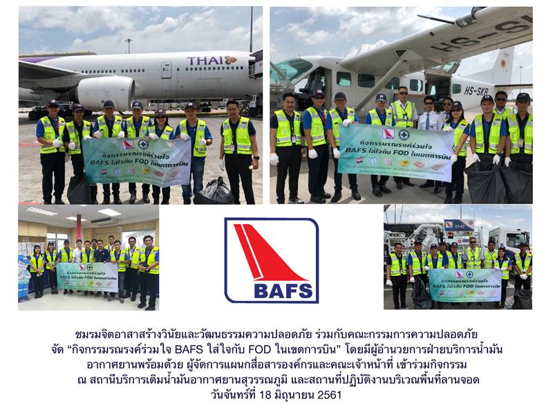 คณะทำงานชมรมจิตอาสาสร้างวินัย และวัฒนธรรมความปลอดภัย ร่วมกับคณะกรรมการความปลอดภัยฯ พื้นที่สถานีบริการเติมน้ำมันอากาศยานสุวรรณภูมิ จัดกิจกรรมรณรงค์ร่วมใจ “BAFS ใส่ใจกับ FOD ในเขตการบิน”