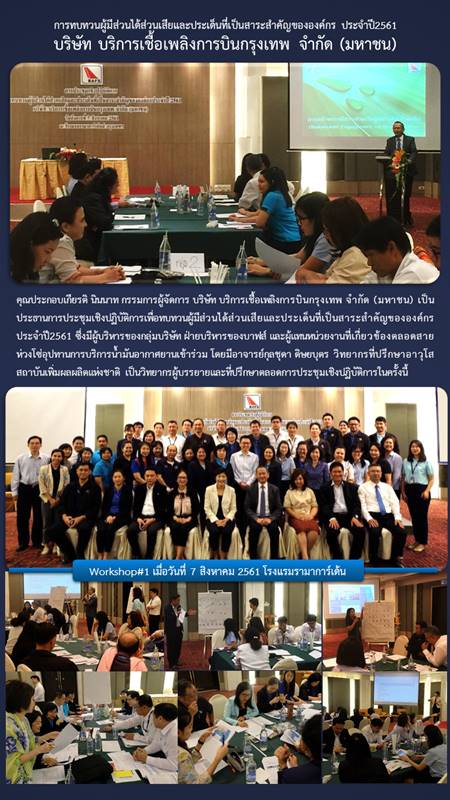 คุณประกอบเกียรติ นินนาท กรรมการผู้จัดการ บริษัทบริการเชื้อพลิงการบินกรุงเทพ จำกัด (มหาชน) เป็นประธานการประชุมเชิงปฏิบัติการ ร่วมด้วยผู้บริหารและตัวแทนหน่วยงานจากกลุ่มบริษัทโดยมี อาจารย์กุลชุดา ดิษยบุตร เข้าบรรยายเรื่องการทบทวนผู้มีส่วนได้ส่วนเสียและประเด็นที่เป็นสาระสำคัญขององค์กร ประจำปี 2561 เมื่อวันอังคารที่ 7 สิงหาคม ณ โรงแรมรามาการ์เด้น และวันอังคารที่ 4 กันยายน 2561 ณ ห้องประชุม 1 สำนักงานใหญ่ ดอนเมือง