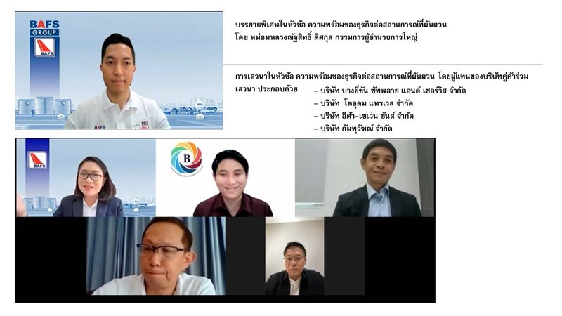 เมื่อวันที่ 26 พฤศจิกายน 2564 BAFS ได้จัดสัมมนา "จรรยาบรรณสำหรับคู่ธุรกิจและกรอบความยั่งยืน ประจำปี 2564" และการเสวนาในหัวข้อ "ความพร้อมของธุรกิจต่อสถานการณ์ที่ผันผวน" ผ่านระบบ Online โดยมีผู้แทนของบริษัทคู่ค้าเข้าร่วมการเสวนา จำนวน 4 รายคือ บริษัท บางยี่ขัน ซัพพลาย แอนด์ เซอร์วิส จำกัด บริษัท โตอุดม แทรเวล จำกัด บริษัท อีด้า-เซเว่น ซันส์ จำกัด และ บริษัท กัมพุวัฑฒ์ จำกัด