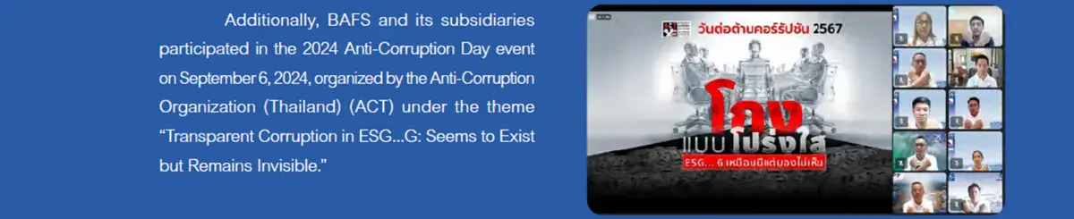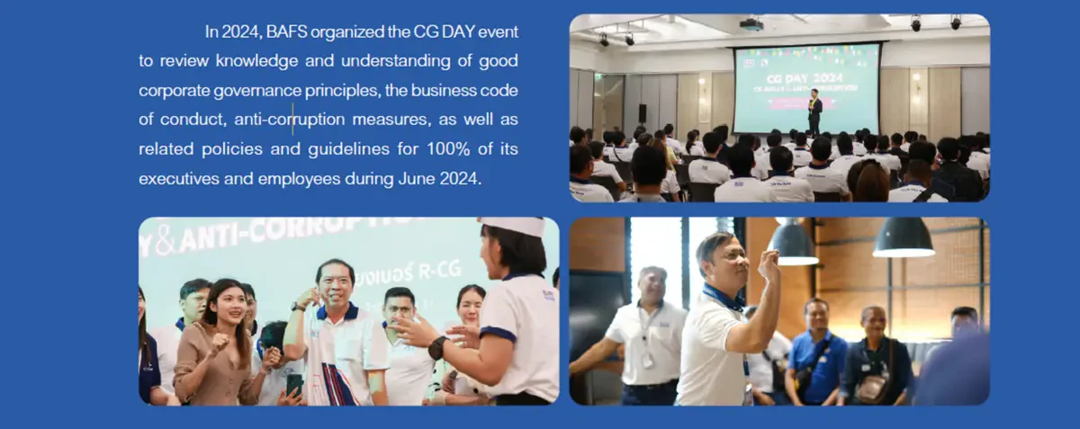 - จัดกิจกรรม GROUP DAY เพื่อเปิดโอกาสให้พนักงานกลุ่มบริษัทได้พบปะ สังสรรค์ เป็นการส่งเสริมการสร้างสัมพันธ์อันดีและการทำงานเป็นทีมระหว่างพนักงาน BAFS Group